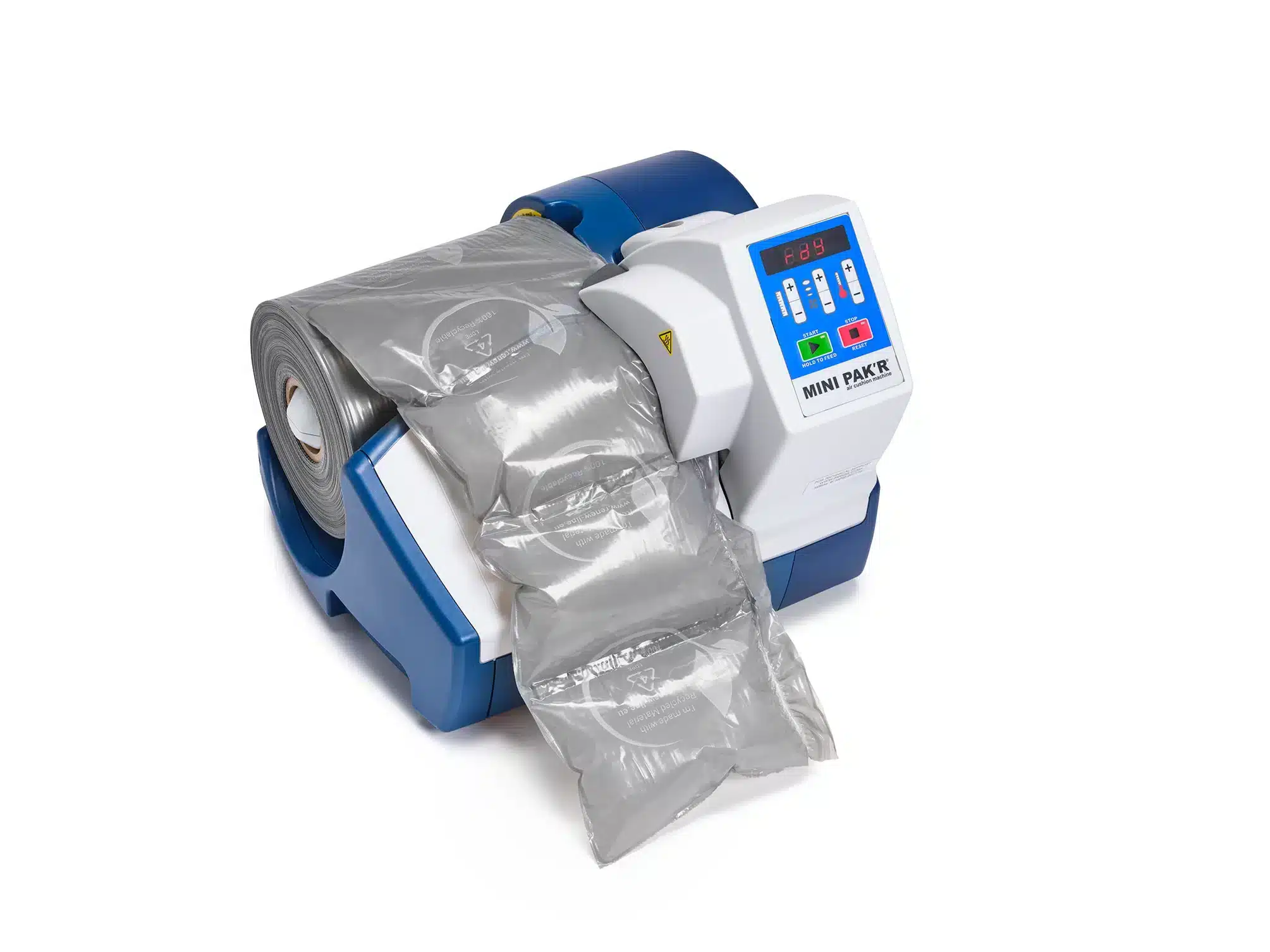 Máquina Mini Pak’r para la creación de almohadillas de aire, ideal para embalaje de productos frágiles. Rápido y eficiente, permite inflar bolsas de aire para proporcionar una protección segura y ligera durante el envío y almacenamiento de productos delicados.